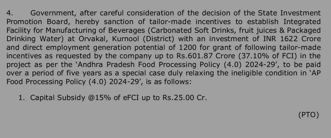 After carefully examining the decision of the State Investment Promotion Board, the government approved the sanction of tailor-made incentives up to ₹601.87 crore, which is 37.10 percent of the total fixed capital investment (FCI), as requested by the company, in accordance with the ‘Andhra Pradesh Food Processing Policy (4.0) 2024–29’. These incentives were approved to be paid over a period of five years by specifically relaxing the ineligible condition in the ‘AP Food Processing Policy (4.0) 2024–29’. That too, without even a single rupee difference from the amount sought by the company—whatever was asked was given in full. In this regard, the government has recently issued a GO as well.