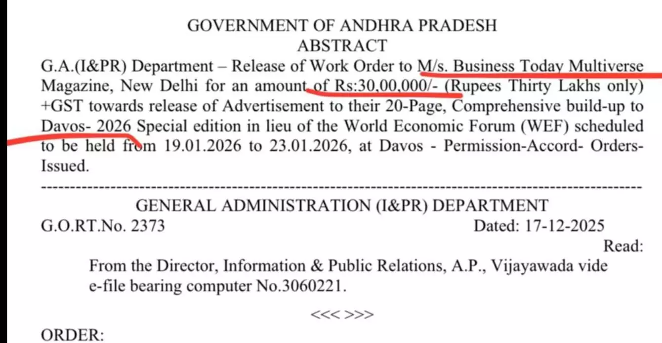 As usual, this year too, Chief Minister Chandrababu Naidu, Minister Nara Lokesh, Industries Minister T. G. Bharat, along with a team of officials, are set to go to Davos. A government order related to this has already been issued. Now, for advertisements in 20 pages of comprehensive information in the Business Today Multiverse magazine at the World Economic Forum meeting to be held in Davos, the Andhra Pradesh government has issued orders allocating ₹30 lakh. GST will be additional to this amount. Accordingly, Chief Secretary S. Suresh Kumar issued a GO on Wednesday. This may not stop here. It is being said that more such GOs may be issued in the coming days. Last year as well, lakhs of rupees were released for promotions on several national business channels.