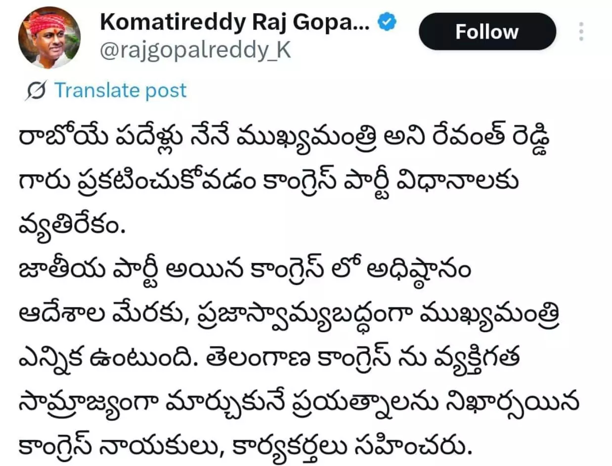 After the Congress party came to power in Telangana, one of its MLAs directly objected to a statement made by Chief Minister Revanth Reddy. He tweeted to this effect. Chief Minister Revanth Reddy has been repeatedly saying that the Congress party will rule Telangana for ten years and that they will win the next elections as well. He has already made this statement several times. He has been stating that just like the people of Telangana gave BRS a chance for ten years, they will also give the same chance to the Congress party. However, during a meeting held as part of his tour in Mahbubnagar on Friday, CM Revanth Reddy announced that for the next ten years, a child of Palamuru will remain the Chief Minister. This has now become a matter of controversy. Senior MLA Komatireddy Rajagopal Reddy responded on the 'X' platform regarding this. He stated that Revanth Reddy’s statement does not align with the party line.