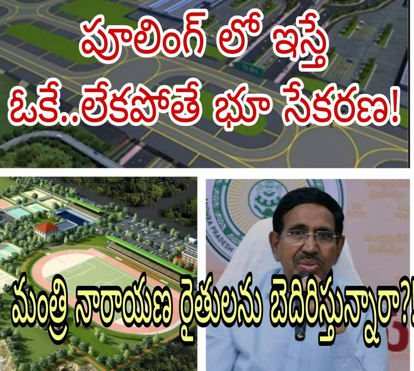 నారాయణ మాటలు చూస్తుంటే పూలింగ్ కి ఓకే అంటే ఓకే ..లేక పోతే ఈ అవసరాల కోసం భూ సేకరణకు వెనకాడం అనే సంకేతాలు ఇచ్చారు అనే చర్చ సాగుతోంది. ఇది రాబోయే రోజుల్లో అమరావతి రైతుల్లో ఆందోళన రేపటం ఖాయంగా కనిపిస్తోంది. పూలింగ్ తో పాటు ఏ మార్గంలోనూ రైతులు ఇప్పుడు ప్రభుత్వానికి అదనంగా ఎలాంటి భూమి ఇవ్వటానికి సిద్ధంగా లేరు అని అమరావతి ప్రాంతంలోని టీడీపీ ఎమ్మెల్యేలు కొంత మంది అనధికారికంగా చెపుతున్నారు. అదనపు భూసేకరణ అంశంలో ఎలాంటి వివాదాలు తలెత్తినా మొత్తం అమరావతి ప్రాజెక్ట్ పై ఈ ప్రభావం పడుతుంది అనే ఆందోళన కూడా రైతుల్లో ఉంది. మంత్రి నారాయణ గురువారం నాడు మీడియా సమావేశంలో చేసిన వ్యాఖ్యలు ఇలా ఉన్నాయి. . ‘ అమరావతి లో పెరిగిన భూముల విలువ నిలవాలంటే..మరింత పెరగాలంటే ఇక్కడ ఎకనామిక్ యాక్టీవిటీ పెరగాలి. ఎకనామిటీ యాక్టీవిటీ పెరగాలంటే ఖచ్చితంగా స్మార్ట్ ఇండస్ట్రీస్ రావాలి. స్మార్ట్ ఇండస్ట్రీస్ రావాలంటే కొంత ల్యాండ్ కావాలి. అసలు స్మార్ట్ ఇండస్ట్రీస్ అంటే ఐటి పరిశ్రమలు..పెద్ద పెద్దవి. హైదరాబాద్ లో ఆ రోజు చంద్రబాబు వాళ్లకు ల్యాండ్ ఇస్తే వాళ్ళు పెట్టబట్టే హైదరాబాద్ ఇప్పుడు అలా ఎదిగింది. అలాగే అమరావతి కాపిటల్ సిటీ కూడా ఎదగాలంటే పెద్ద పెద్ద కంపెనీ లు..స్మార్ట్ ఇండస్ట్రీస్ రావాలి. వాళ్ళు రావాలంటే ఇంటర్నేషనల్ ఎయిర్ పోర్ట్ లేంది రారు. వాళ్ళు అక్కడో ...ఎక్కడో దిగి రారు. అందువల్ల ఖచ్చితంగా ఒక ఇంటర్నేషనల్ ఎయిర్ పోర్ట్ కట్టాలనే ఉద్దేశంతో ..అంతే కాకుండా హైదరాబాద్ కు ఒక వైబ్రేషన్ వచ్చింది ఆ రోజు సీఎం చంద్రబాబు నేషనల్ గేమ్స్ కండక్ట్ చేశారు.