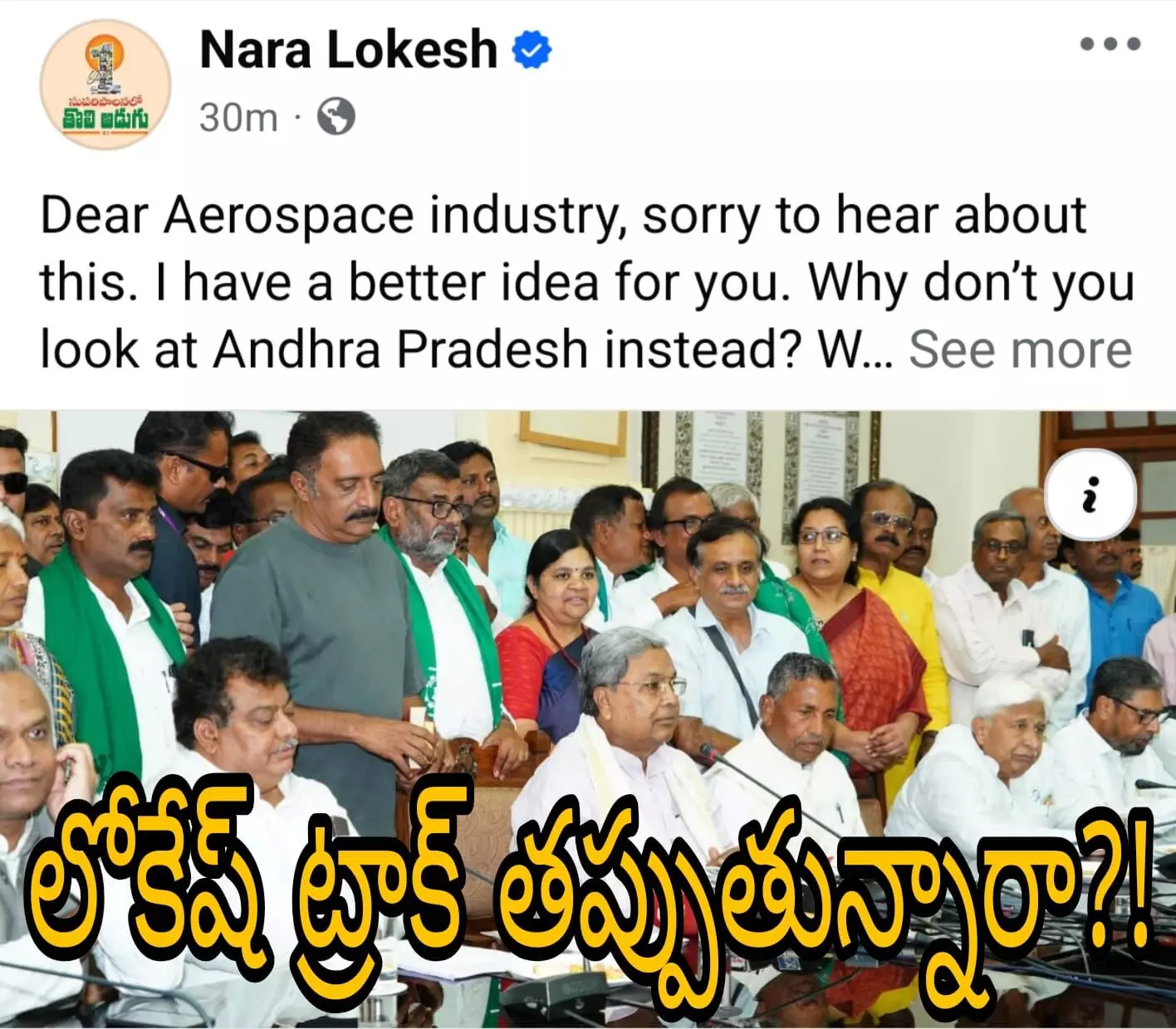 ఆంధ్ర ప్రదేశ్ కు పెద్ద ఎత్తున పరిశ్రమలు తీసుకురావాలి. రాష్ట్రంలో భారీ ఎత్తున ఉపాధి అవకాశాలు కల్పించాలి అని కోరుకోవటం తప్పు కాదు. ఆ దిశగా గట్టి ప్రయత్నం చేయటం కూడా అభినందించదగ్గ విషయమే. కాకపోతే ఇందుకు అనుసరిస్తున్న విధానాలు కూడా ఇక్కడ ఎంతో ముఖ్యం అనే చెప్పాలి. గత ఏడాది కాలంలో ఆంధ్ర ప్రదేశ్ కు కొత్త పరిశ్రమలు తెచ్చే విషయంలో కూటమి ప్రభుత్వం ఒకింత దూకుడుతోనే వెళుతుంది అని చెప్పొచ్చు. అయితే ఇక్కడ కొన్ని విమర్శలు కూడా ఉన్నాయి. రాష్ట్రానికి వచ్చే కంపెనీలు పెట్టే పెట్టుబడుల కంటే ప్రభుత్వం ఇచ్చే భూములు...రాయితీలు చూస్తే వీటి వల్ల లాభం ఆంధ్ర ప్రదేశ్ రాష్ట్రానికి కంటే ఆయా కంపెనీలకే ఎక్కువ అన్న ఆరోపణలు కూడా ఉన్నాయి. ఒక వైపు హిందీ జాతీయ భాష అంటూ నారా లోకేష్ చేసిన వ్యాఖ్యలు సోషల్ మీడియా లో పెద్ద ఎత్తున దుమారం రేపుతున్న వేళ కర్ణాటక ఏరోస్పేస్ ఇండస్ట్రీని ఉద్దేశించి ఆయన పెట్టిన పోస్ట్ ఒకటి తీవ్ర విమర్శలకు కారణం అవుతోంది. రైతుల నుంచి వస్తున్న తీవ్ర వ్యతిరేకతకు తలొగ్గి కర్ణాటకలోని కాంగ్రెస్ ప్రభుత్వం బెంగళూరు విమానాశ్రయం వద్ద ఏరోస్పేస్ పార్క్ కోసం సేకరించదలచిన భూసేకరణ విషయంలో వెనక్కి తగ్గింది. ఈ పార్క్ కోసం తొలుత దేవనహళ్లి తాలూకాలో 1777 ఎకరాలు భూమిని సేకరించాలని నిర్ణయించారు.