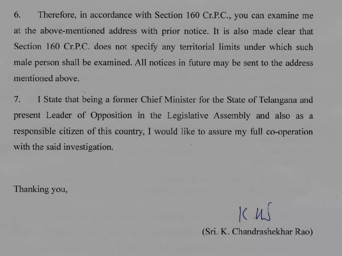 Invoking Section 160 of the CrPC, KCR requested that the inquiry be conducted at his residence. Referring to the provision in law that persons above 65 years of age should not be called to a police station, KCR stated that his residence is in Erravalli village of Markook mandal in Siddipet district, and requested that the inquiry be conducted there. He also mentioned in his response that future notices should be sent to this residential address. In his letter, KCR stated that as a former Chief Minister and as the Leader of the Opposition, he would fully cooperate with the investigation. It is already known that SIT officials have questioned former ministers KTR and Harish Rao, as well as former MP Santosh Rao, in the telephone tapping case. Official sources say that once KCR is also questioned, the entire matter will reach a conclusion.