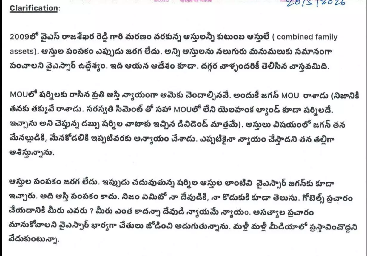 In this backdrop, Vijayamma has now issued a notarized statement through her advocate regarding the property issue. In it, she made several key points. She clarified that all assets up until YSR’s death in 2009 were family properties, and that no formal division of assets had ever taken place. She stated that YSR’s intention—and his directive—was that all assets should be equally distributed among his four grandchildren. According to Vijayamma, this is a known fact among all close family members. She further stated that every asset mentioned in the MoU in favor of Sharmila rightfully belongs to her. She added that Jagan himself had signed another MoU acknowledging this. In fact, she said, Sharmila was allotted less than what she deserved, and even properties not included in the MoU—such as the Yelahanka land and Saraswati Cement—rightfully belong to Sharmila.
