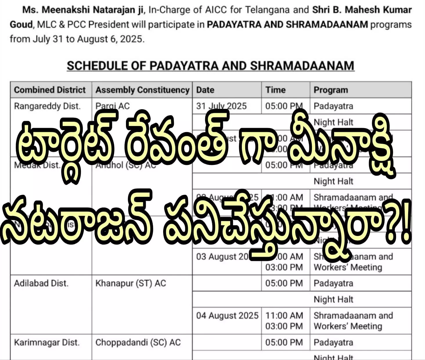 తెలంగాణ లో సాఫీగా సాగుతున్న ప్రభుత్వాన్ని ముందుకు సాగనివ్వటం కాంగ్రెస్ హై కమాండ్ కు ఏ మాత్రం ఇష్టం లేనట్లు ఉంది. గతంలో ఎన్నడూ లేని రీతిలో రాష్ట్రంలో కాంగ్రెస్ హై కమాండ్ కొత్త సంస్కృతిని ప్రవేశపెడుతున్న తీరు చూసి కాంగ్రెస్ నేతలు కూడా అవాక్కు అవుతున్నారు. ముఖ్యమంత్రి రేవంత్ రెడ్డి పై అసంతృప్తితోనే అధిష్ఠానం ఇది అంతా చేస్తుంది అనే అనుమానాలు కూడా కొంత మంది నేతల్లో వ్యక్తం అవుతున్నాయి. తెలంగాణ ముఖ్యమంత్రి రేవంత్ రెడ్డి, కాంగ్రెస్ అగ్రనేత రాహుల్ గాంధీ ల మధ్య బాగా గ్యాప్ వచ్చింది...కనీసం రేవంత్ రెడ్డి కి రాహుల్ అపాయింట్మెంట్ కూడా ఇవ్వటం లేదు అని రాజకీయ వర్గాల్లో ఇటీవల వరకు పెద్ద ఎత్తున ప్రచారం జరిగింది. విపక్షాల నాయకులు అయితే ఇదే అంశంపై పలు మార్లు ప్రకటనలు కూడా చేశారు. తాజాగా ఢిల్లీ లో తెలంగాణాలో విజయవంతంగా నిర్వహించిన కులగణన, బిసి రేజర్వేషన్ల కు సంబంధించిన అంశంపై ఏర్పాటు చేసిన సమావేశంలో రాహుల్ గాంధీ స్వయంగా ముఖ్యమంత్రి రేవంత్ రెడ్డి తో పాటు ఆయన టీం బాగా చేశారు అని ప్రశంసలు కురిపించారు. దీంతో చాలా వరకు రేవంత్, రాహుల్ మధ్య గ్యాప్ అంశంలో నిజం లేదు అనే ప్రచారాన్ని కూడా తెర మీదకు తీసుకువచ్చారు. అంతా బాగా సెట్ అయింది అనుకున్న సమయంలో సోమవారం సాయంత్రం కాంగ్రెస్ పార్టీ అంటే గాంధీ భవన్ నుంచి వచ్చిన ప్రకటన చూసి చాలా మంది అవాక్కు అయ్యారు అనే చెప్పాలి. అదేంటి అంటే తెలంగాణ కాంగ్రెస్ వ్యవహారాల ఇంచార్జి మీనాక్షి నటరాజన్ జులై 31 నుంచి రాష్ట్రంలోని పలు జిల్లాల్లో పాదయాత్ర నిర్వహించటం తో పాటు శ్రమదానం చేస్తారు అని అధికారికంగా వెల్లడించారు. కాంగ్రెస్ ఇంచార్జి తో పాటు పీసిసి ప్రెసిడెంట్ మహేష్ కుమార్ గౌడ్ తో పాటు ఆయా జిల్లాల నేతలు పాల్గొంటారు అని తెలిపారు.