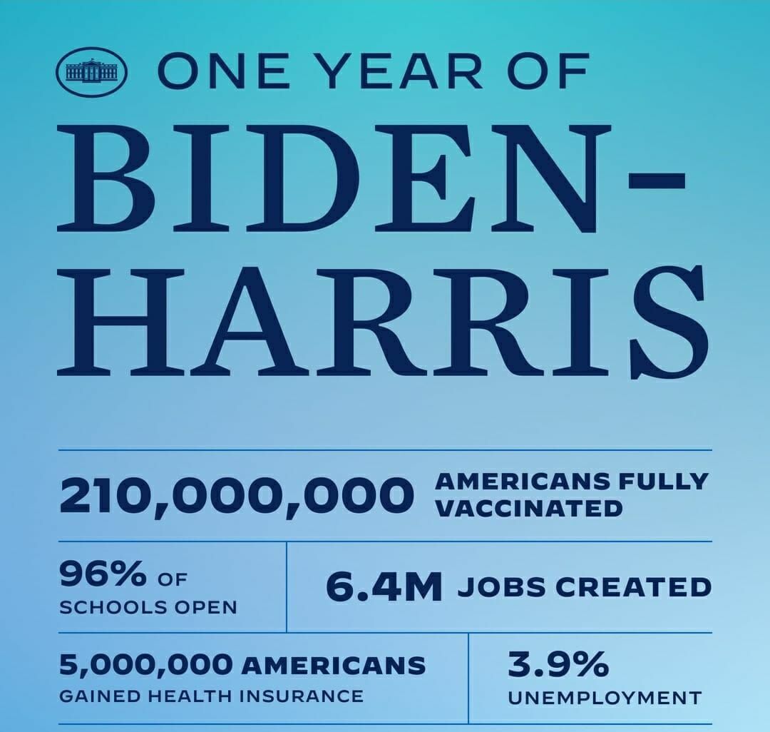 అమెరికా అధ్యక్షుడిగా జో బైడెన్, ఉపాధ్యక్షురాలిగా కమలా హ్యారిస్ లు ఏడాది కాలం పూర్తి చేసుకున్నారు. ఏడాది పాలనా కాలంలో తాము చేసిన పనులను వివరిస్తూ వీరిద్దరూ తమ తమ అధికారిక ఖాతాల నుంచి సోషల్ మీడియాలో పోస్టులు పెట్టారు. గత ఏడాదిగా అమెరికాలో లక్షల ఉద్యోగాలు కల్పించామని తెలిపారు. నిరుద్యోగాన్ని 3.9 శాతానికి తగ్గించామని వెల్లడించారు. అమెరికా పౌరులకు పూర్తి స్థాయి వ్యాక్సినేషన్ అందించేలా చేయటంతోపాటు..అమెరికన్లకు పెద్ద ఎత్తున వైద్య బీమా ప్రయోజనాలు కల్పించామని తెలిపారు.